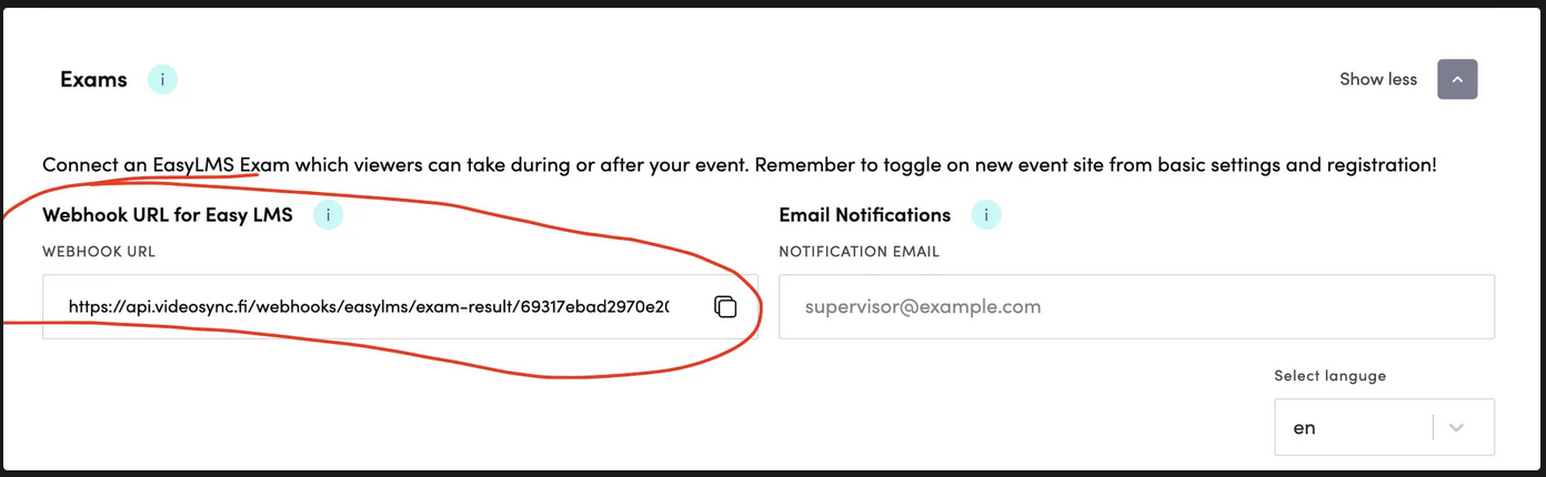 - Copy the webhook URL in your event. The Webhook URL is event specific. Add it in Easy LMS to each exam you have in the event.