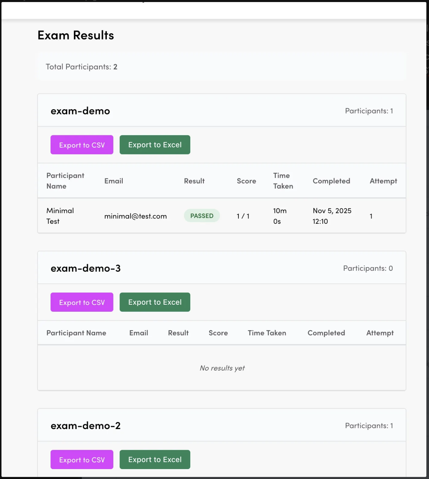 - When users complete exams, the webhook will now receive data about completions. If email notifications are configured in the videosync admin panel, a specified user can receive emails about exam completions. Exam completion data can also be accessed in the Analytics Dashboard. The dashboard supports exporting exam data to CSV and Excel.